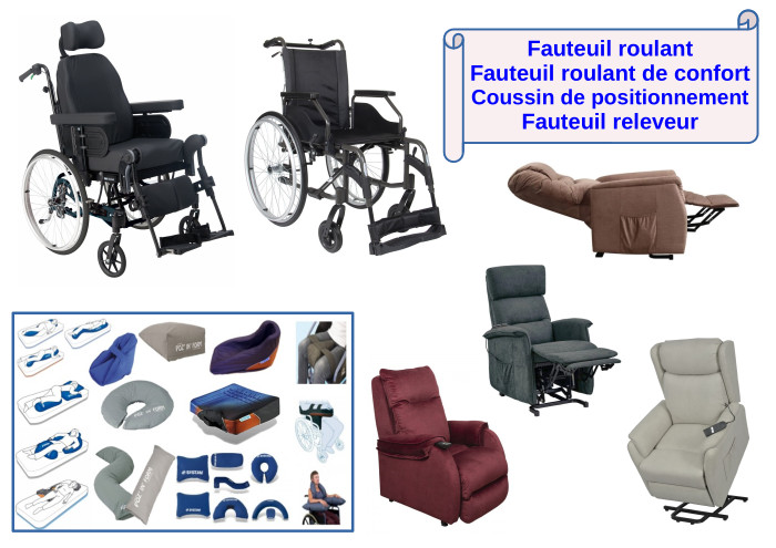 Des chaussures thérapeutiques ou de confort (femme, homme), fauteuil releveur, fauteuil roulant de transfert, accessoires pour la salle de bain et les toilettes, produits pour l'hygiène, vêtements (grenouillères, culottes...), accessoires pour la marche (canne, déambulateur…) et objet facilitant la vie quotidienne (pilulier, verre, téléphone...).