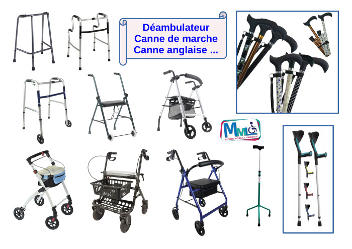 - Canne anglaise: permet de se mouvoir en double appuis dans le cadre d'une immobilisation totale ou partielle d'un de ses membres inférieurs.